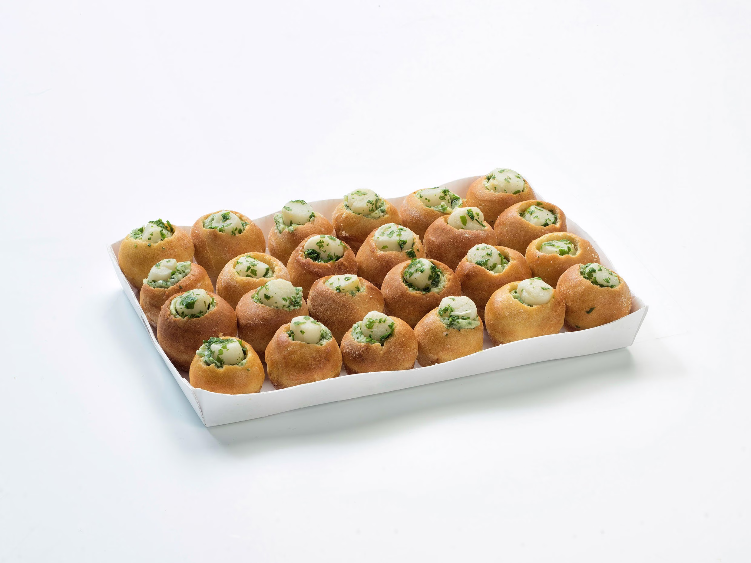 Plateau de 24 mini brioches garnies d’une noix de St Jacques et d’une garniture aillée et persillée
